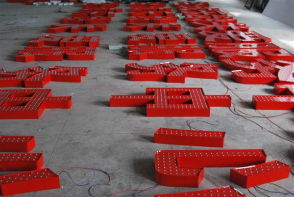 外露發(fā)光字又被稱為不銹鋼沖孔發(fā)光字、鈦金字、鋅鐵字等,分別由不銹鋼板,鈦金板,鍍鋅鐵板沖孔后,裝上LED防水燈串制作而成。在制作前要先選好材料,做什么字,選什么材料,根據(jù)字體大小,安裝的位置和客戶的要求,選擇相應的板材,然后把整張的板材用機床進行沖孔,然后用刻機對面板刻出字形,然后把刻好的字焊接成立體邊,再進行打磨光滑,避免毛刺。然后就是噴烤油漆,油漆干后,就可以裝LED單顆燈串了,裝燈串的時候務必要考慮能夠方便接線,每顆燈用橡膠套做風水處理,這么做也比較有利于后期對外露發(fā)光字進行維護。